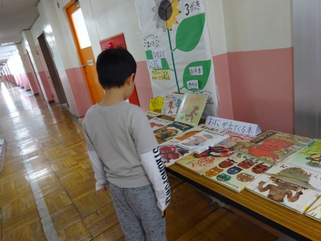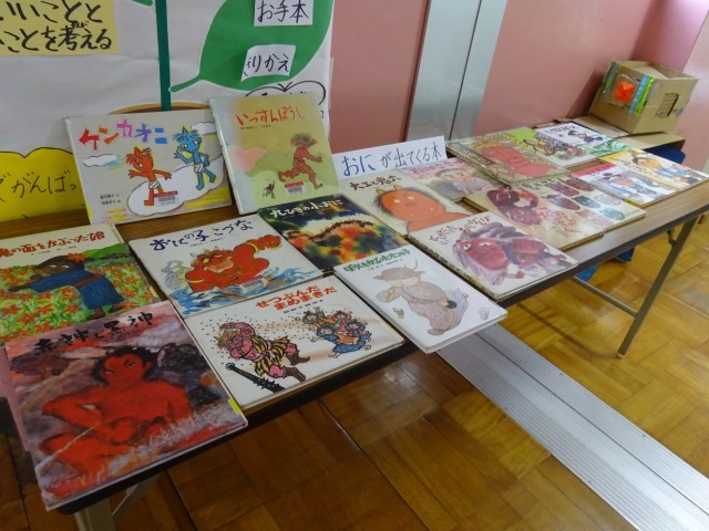 「ないた赤おに」を学習している2年生。教室の前には「おに」が出てくる本がずらりと揃えてありました。