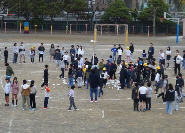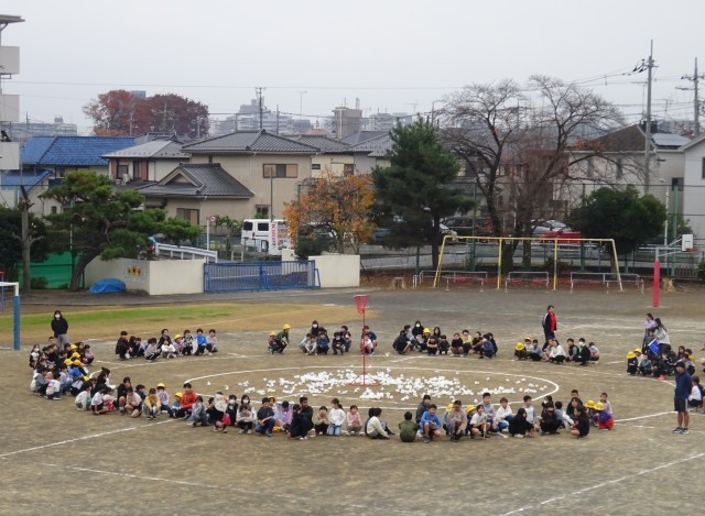 今日は久しぶりの児童集会。学級閉鎖で延期になっていた全校玉入れをしました。