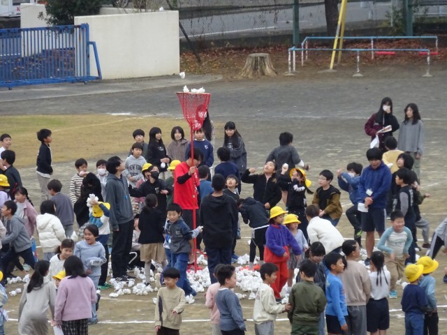 サンフラワー班の赤色グループと黄色クループに分かれ、集会委員会手作りの玉をかごに向かって投げ入れました。