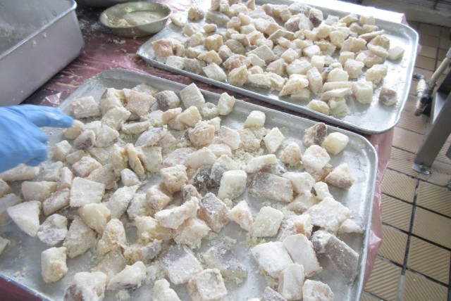 ほきのピリカラ揚げは、ほきの角切りに酒としょう油で下味をつけ、でん粉をまぶして揚げます。そこへ、砂糖・しょう油・酒・みりん・一味唐辛子で作った甘辛たれをからめた料理です。魚が苦手な人も、食べられると好評です。
