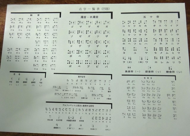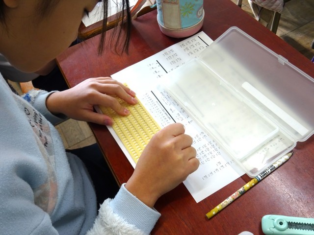 点筆という道具を使って点字を書きますが、マスにある6点の組み合わせで音を表すために、表を見ながら真剣に書いていました。
