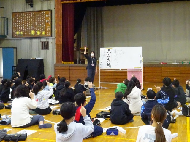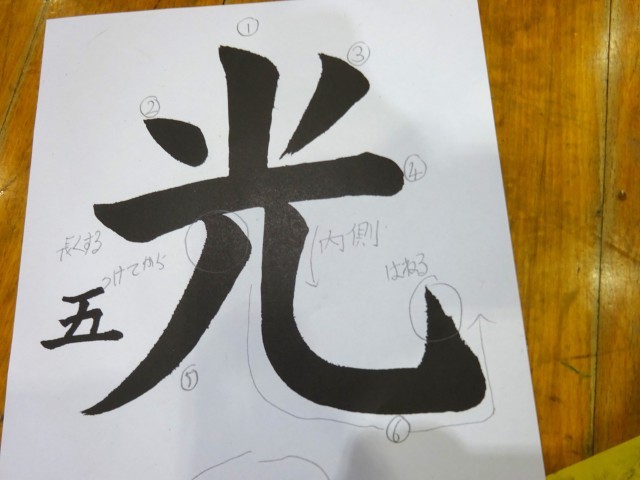 先生は、筆の運び方を一画ずつ丁寧に指導し、子供たちも一緒に空書きをします。