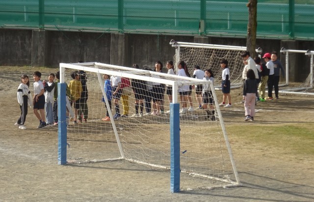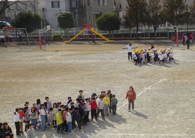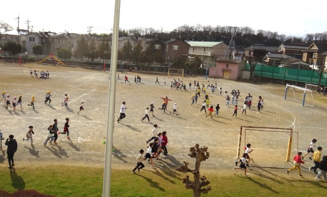 1,2年生はトラックの内側、3年生以上は外側とスタート位置を4か所に分けて走り始めます。