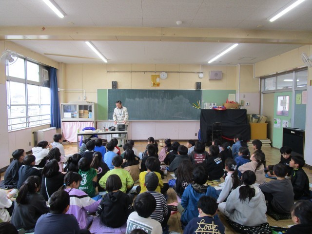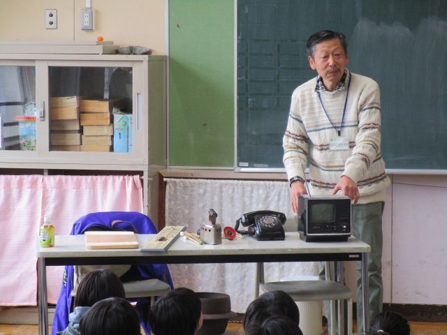 3年生では、現在、社会科で「市のうつりかわり」について学習をしています。その中で、昔の道具について地域の学校運営協議会会長にお願いをして昔の道具や生活についてお話をいただきました。テレビや黒電話、アイロンなど昔の生活とともにお話をしてくださいました。