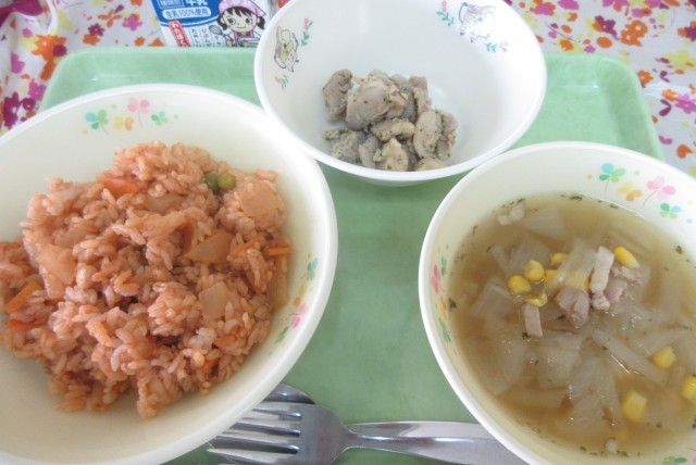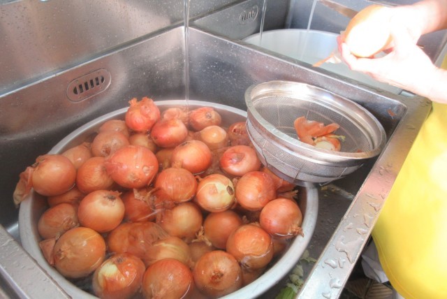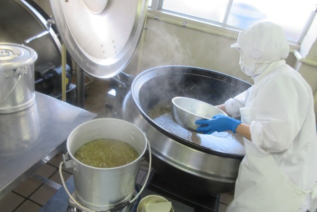 「旨みたっぷり」薄味でもおいしい給食になるひみつは、食材から「旨み」を引き出す工夫をしているからです。スープの玉ねぎは、じっくり、あめ色になるまで炒めています。今日は40Kgの玉ねぎを使いました。
