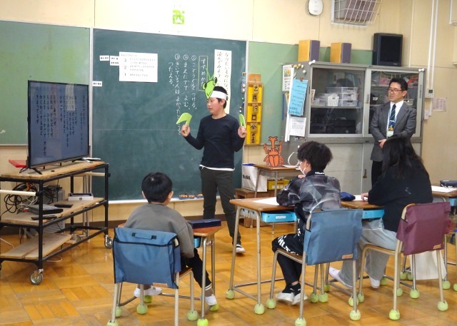 たくさんの先生が見守る中、登場人物(カマキリ、カブトムシ)になりきって、音読発表をしました。
