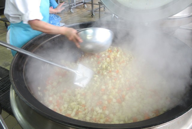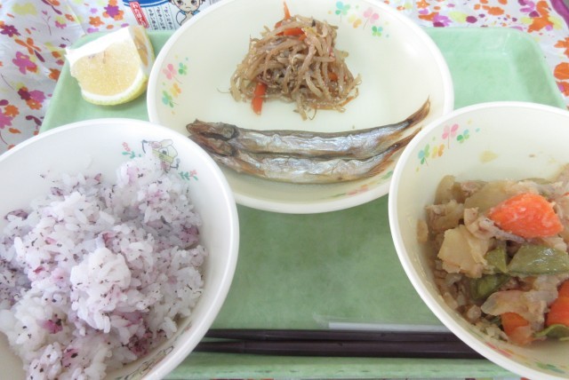 肉じゃがは人気の献立です。じゃがいもには、ビタミンC,B1,B2が多く含まれています。その中でもビタミンCは熱に弱いのですが、じゃがいものビタミンは加熱調理しても壊れにくいのが特徴です。今日は53㎏のじゃがいもを使いました。