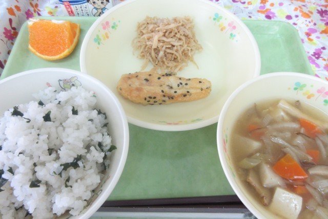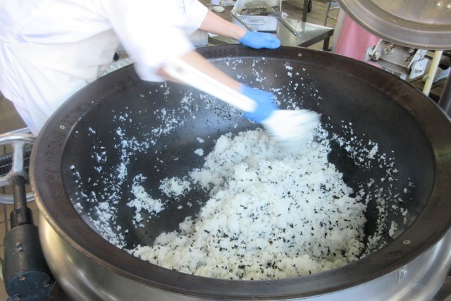 三陸わかめごはん・・・今日のごはんは、アルファ化米です。わかめは三陸の海で多くつくられています。