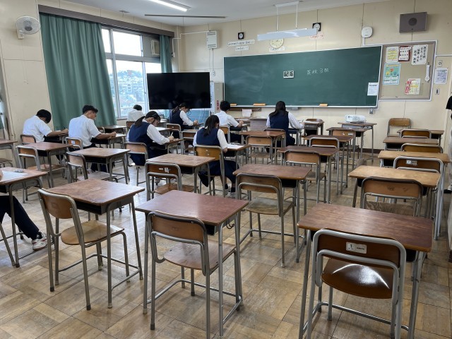 少し暑さの復活した週末となりました。放課後には学運協主催 英語検定が行われました。中学生15名、小学生3名の受験でした。日々の学習の成果発揮のチャンスとなりました。今後も各自のペースで学習を進めていきましょう。ご関係の皆様 ご協力ありがとうございました。画像は美術室前ギャラリー、3年教室 音楽祭 掲示物作成中、英検実施中 です。