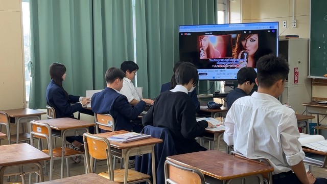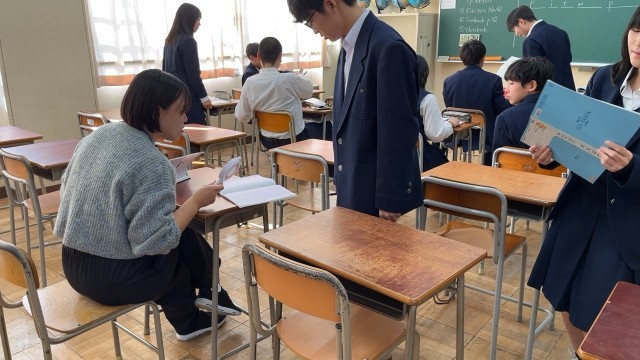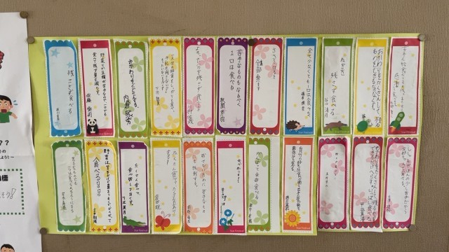 平常授業日です。3年生は本日より給食後下校、進路面談開始となりました。画像は2年英語授業、食育もったいない大作戦 掲示物 です。