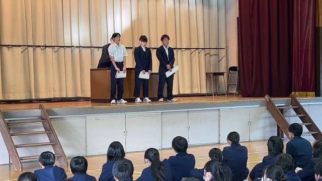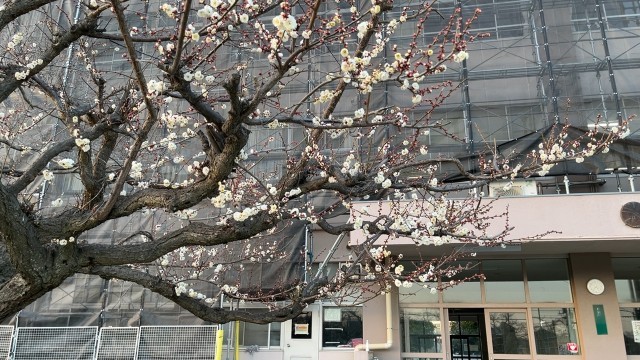 週明け 平常授業日です。朝礼、昼休み生徒会主催体育館開放、一斉委員会が行われました。校庭梅の花がかなり咲き始めました。