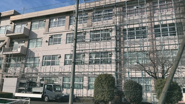 ・「校舎周りの足場 解体中」屋上防水工事 もうじき終了