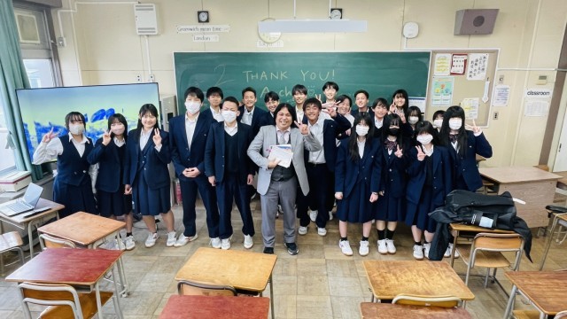 昨日 ALT アーチー先生 今年度最後の授業後 なごりを惜しみみんなで集合しているところ などです。