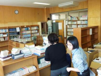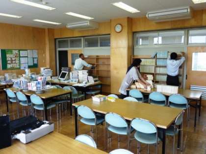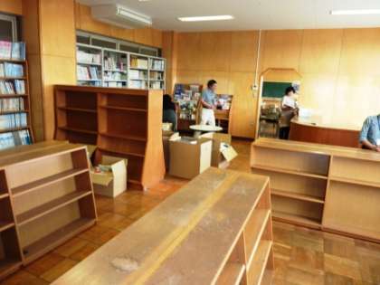 教育センターから巡回訪問で3人の方がみえました。今日は、書架やカウンターの移動です。昨日、図書委員の生徒が書架の本を箱詰めして空けていたので、移動がスムーズにできました。配置を変えただけで、明るく、広く、感じられて、図書室の雰囲気がとてもよくなりました。