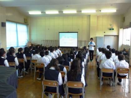今日の1年生の6校時は、大塚製薬株式会社の管理栄養士の方を講師として、熱中症予防「元気に過ごせる水分補給」の講演です。適切な運動と水分補給の仕方、熱中症の症状や発生に関係するもの・・などを学びました。真夏に向けて、自分の健康・体調の管理を正しく行う手がかりとなりました。熱中症予防のテキストをいただきました。ご家庭でもお読みいただき、熱中症の予防をしましょう。
