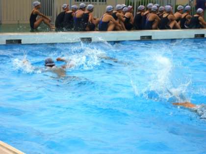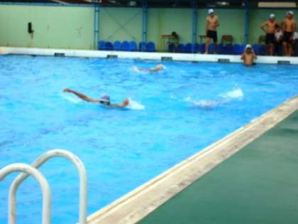 少しだけ雨が・・・でもみんな元気で泳いでいます。3年体育水泳です