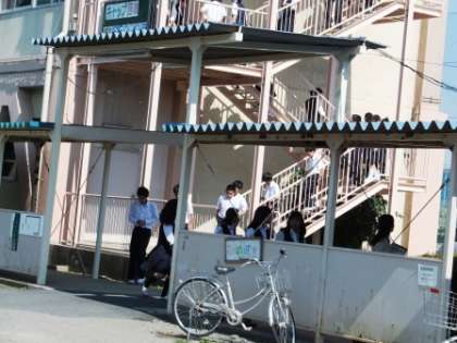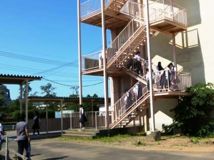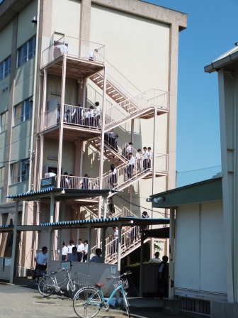 不審者が校舎内に侵入したという想定で、避難訓練を実施しました。非常階段を使って、体育館に避難します。大勢の生徒が安全に注意しながら、非常階段から体育館へ避難しました。