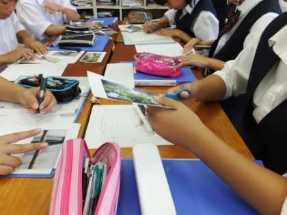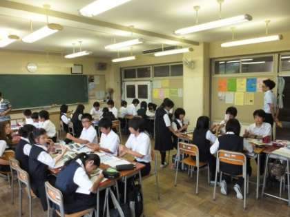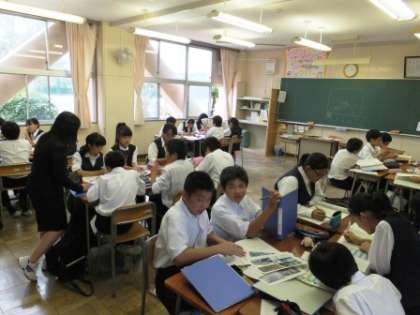横川地域周辺の学習です。引き続き、グリーンマップの制作に取り組んでいます。ワークシートに、各班で撮った写真を貼り付け、まとめています。学校インターンシップが1組、2組に入り、補助をしています。