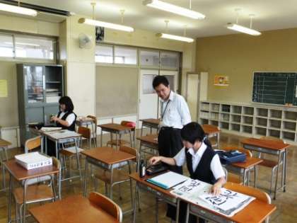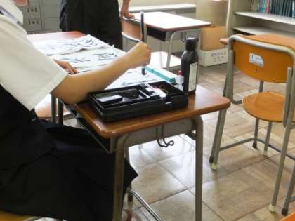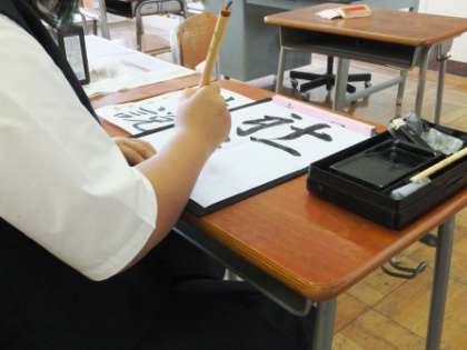 書道部は部員が少ないのですが、顧問と一緒になって活動に頑張っています。今日は「開花」を書いています。
