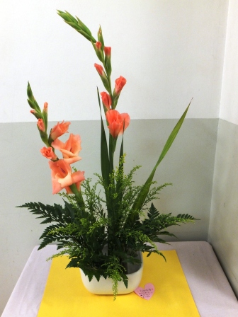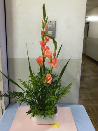 レディクリエイト部、今日の生け花の花材は、「グラジオラス」「レザーファン」「ソリダコ」・・・夏です。グラジオラスが、涼やかに、伸びています。