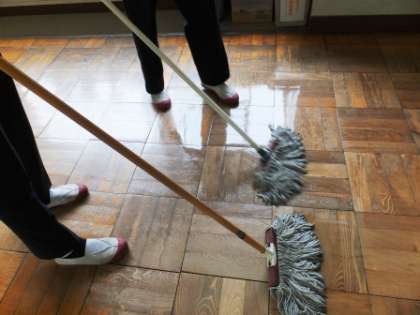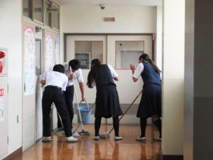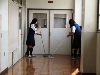 放課後は整美委員会が校舎内の廊下のワックスがけです。各クラスの清掃で水拭きをした後で、整美委員が丁寧にワックスをかけています。