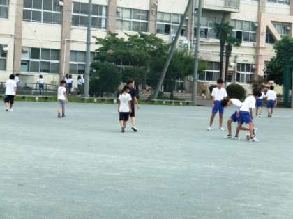 陸上部は昼間の暑い時間帯を避けて、朝7時30分からの活動です。小学生も参加しています。