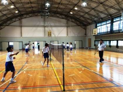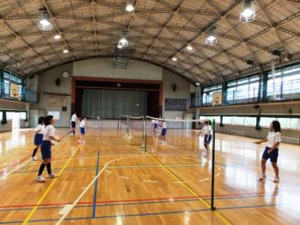 バドミントン部です。雨ですが、体育館は湿度が・・・蒸し暑いです。頑張っています。