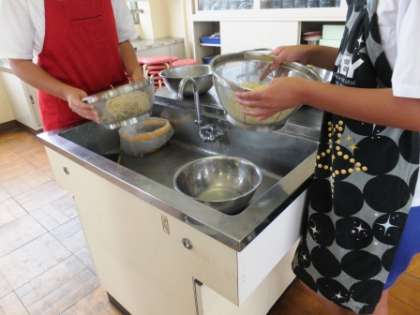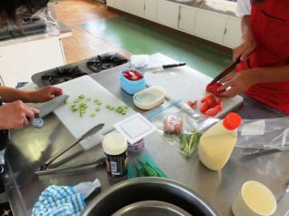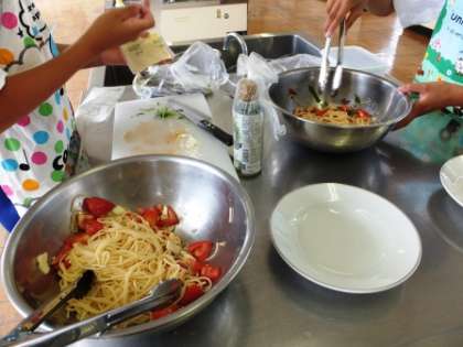 レディクリエイト部です。今日のメニューは、「冷製パスタ」です。具材は、それぞれのお好みで作りました。