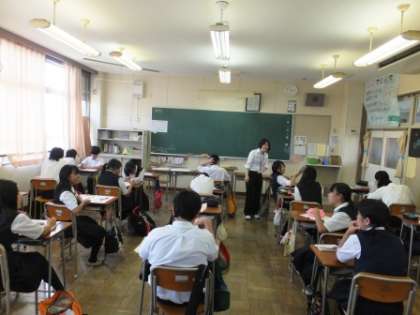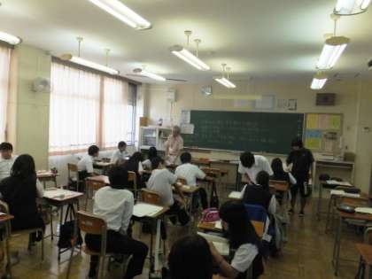 2年生の総合的な学習の時間です。職場体験新聞のレイアウトを考えています。職場体験後、すぐ新聞制作が始められるように・・・です。教室には、担任の外、副担任、インターンシップの学生も補助に入っています。