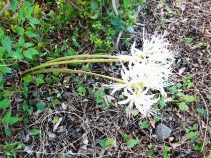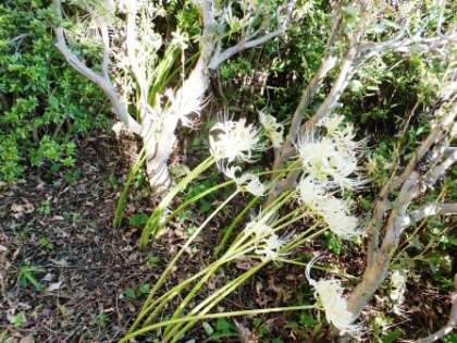今日の朝礼で校長先生のお話の中で紹介された彼岸花、曼珠沙華です。「秋を感じさせられる彼岸花(曼珠沙華)は赤色が多いですが、珍しい白の彼岸花(曼珠沙華)が咲いています。」・・・藤棚、サルスベリの近くで咲いています。
