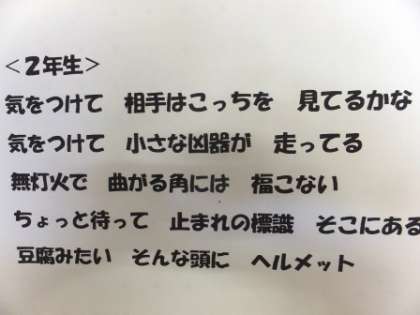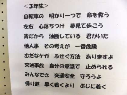 上段は2年生、下段は3年生の標語です。どの標語もよくできていますね。これらの標語のとおり、自転車に乗る時は安全に十分注意しましょう。