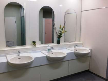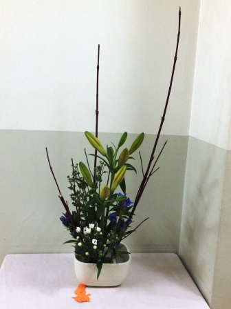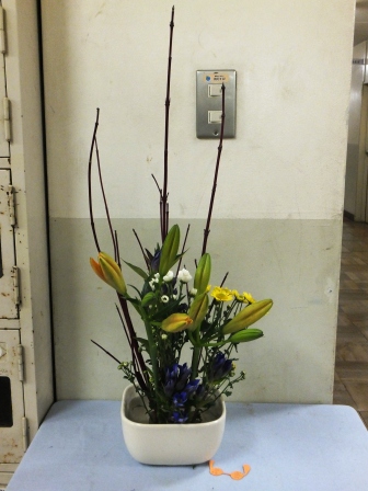今日のレディクリエイト部の生け花です。先日新しいトイレに生け花を飾ったのが好評だったので、今日もトイレに飾りました。花材は「サンゴミズキ」「スカシユリ」「コギク」です。