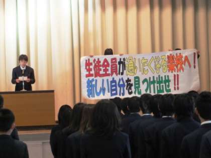 今日の朝礼で、生徒会がスローガンを披露しました。「生徒全員が通いたくなる楽校へ!新しい自分を見つけ出せ!!」です。楽しい学校生活で、新しい自分を伸ばしてほしいですね。