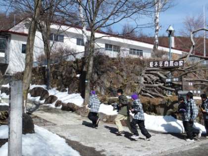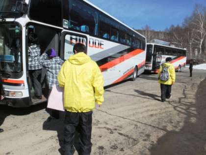 スキーウェアーに着替えて、バスでブランシュたかやまスキーリゾートへ行きます。今年からデザインも変わり新しいスキーウェアーです。おそろいの黄色のスキーウェアーはまるで「双子」のような田中先生、木村先生です。