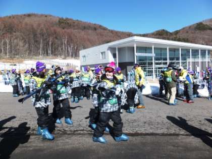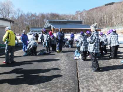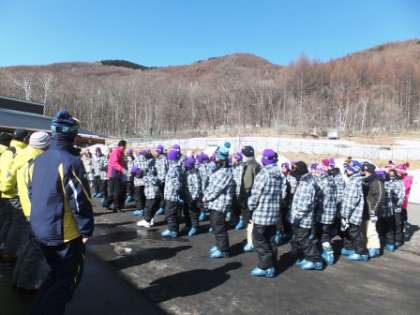 ブランシュたかやまスキーリゾートの前で、スキーブーツに履き替え、いよいよ開校式です。挨拶の後は、スキー実習班のインストラクターの先生の紹介です。班ごとにゲレンデに向かいます。