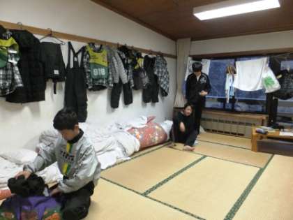 スキー教室2日目です。昨夜から雪が降り始め、今日は積もっています。午前6時30分起床です。朝の、洗顔、布団上げなど・・・・時間通り皆よく動きます。昨日の疲れ「筋肉痛?」、「寝違えて首が痛む」などの生徒が。