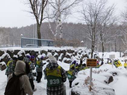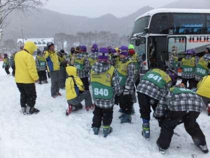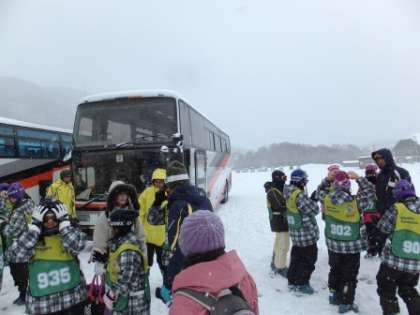 スキー場へ出発です。今日は湿った雪です。積もっています。昨日より寒いので防寒対策をして出かけます。スキー場前でスキーブーツに履き替え、実習班でゲレンデへ。