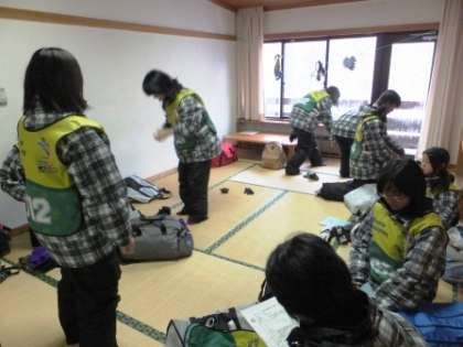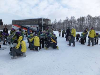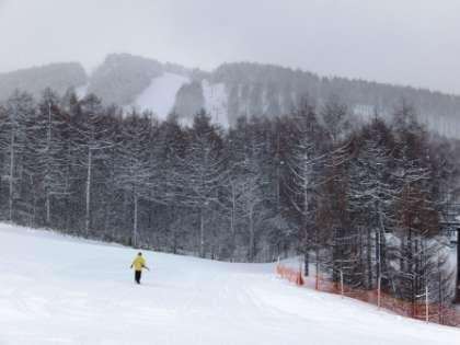部屋の片付けをして、宿舎を出ます。スキー場第2駐車場までバス移動、ブーツに履き替えます。今日は全員山頂まで行きます。少し曇っています。下からの山頂は見えたり、見えなかったりの天候です。