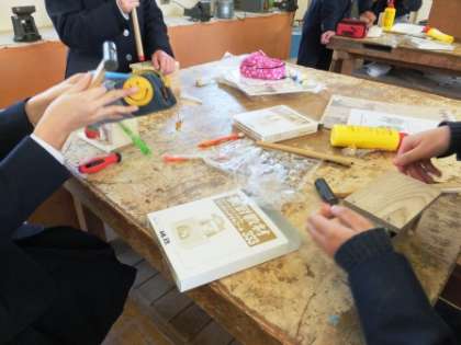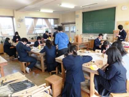2年生の技術です。オルゴール制作をしています。完成に近付いています。オルゴールの音色が少しだけ聞こえました。