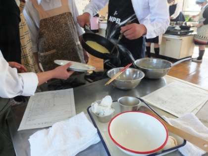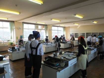 2年生の家庭科は調理実習です。クレープを作っています。廊下にまで甘い香りが・・・
