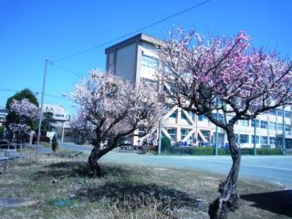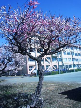 暖かく快晴の、気持ちの良い日です。プール近くの梅は一本の幹に紅梅と白梅が同時に咲いています。他の梅も満開、見事です。今日は3年生の餅つき大会です。
