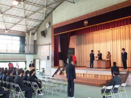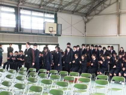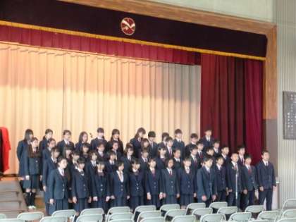 19日(火)の卒業式に向けて予行練習です。礼法や、動き、歌・・・全体の確認です。1・2年生は、3年生の美しく声量のある歌声を聞き、自分達も、大きな歌声など、当日はもっと頑張らなければならないと思いました。