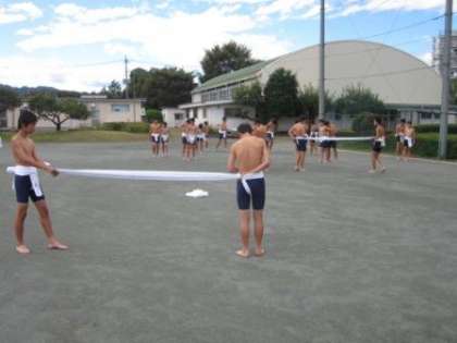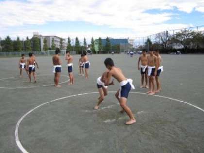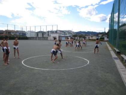 体育の必修である武道です。横川中では相撲を行っています。例年活気ある授業で、生徒も楽しそうにやっています。