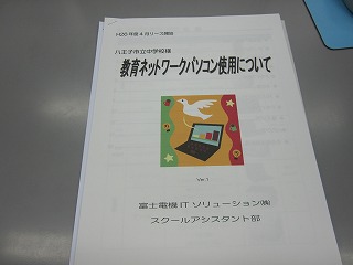 富士電機ITソリューション(株)から4名の講師の先生をお招きして、教育パソコン使用について研修しました。午前は1.コラボノートの説明と体験。2.ホームページアップの方法。(研修中にこのページを作成アップしました。)午後はICTを活用した模擬授業および意見交換会を行いました。