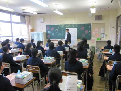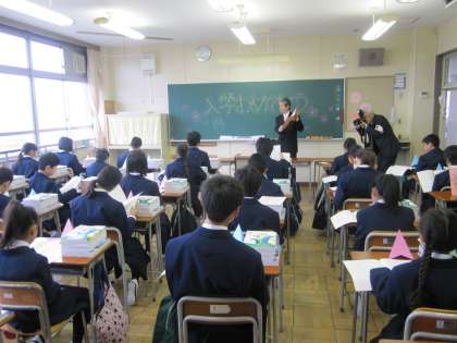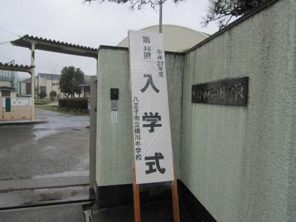 昨日までのあたたかい麗らかな春の日が、今日はあいにくの雨模様の入学式になりました。はつらつとした64名の生徒が横川中学校の門をくぐり入学式の説明を聞いているクラス風景です。