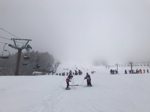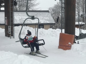一旦止んだ雪がまたちらつき始め、若干視界は良くないですが、今日は初心者班もリフトに乗っています。