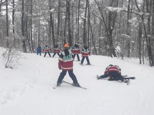 坂の緩やかな林間コースで、ボーゲンでのブレーキ練習です。転びながらも頑張って、無事に下まで降りられました!