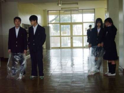 ペットボトルキャップの回収は、毎週火曜日の朝です。(職員室前にはキャップの回収箱があり、いつでも常時受け付けています。)生徒会が昇降口で待ち受け、生徒が持ってくるキャップを袋に集めています。平成23年度、目指すは、ゴーゴー! 55,000個です。みなさまのご協力、さらにお願いいたします。シールをはがし、洗って出してくださると、大変有り難いです。