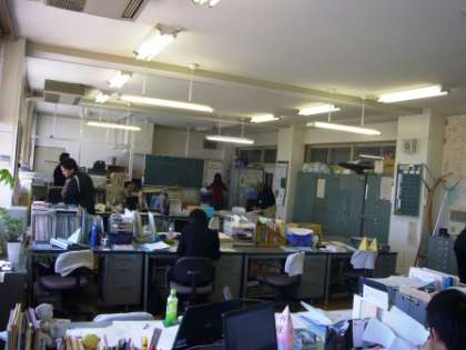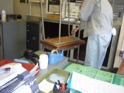 先生方は新学期の準備です。用務の方は、机を、新しい天板に取り替えています。
