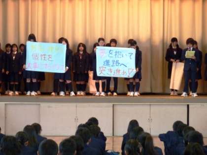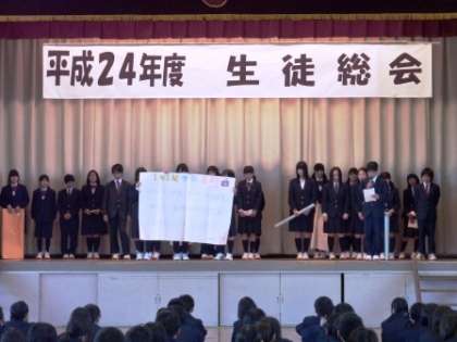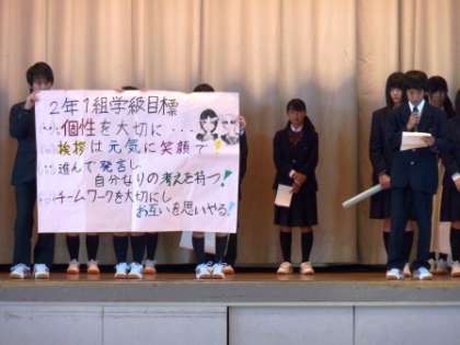 生徒総会の後は、学級目標の発表です。アンケートに、「どの学年もとても立派な態度で参加をし、質疑応答やクラス目標などの発表も大きな声でしっかりとできていたので感心しました。」とありました。